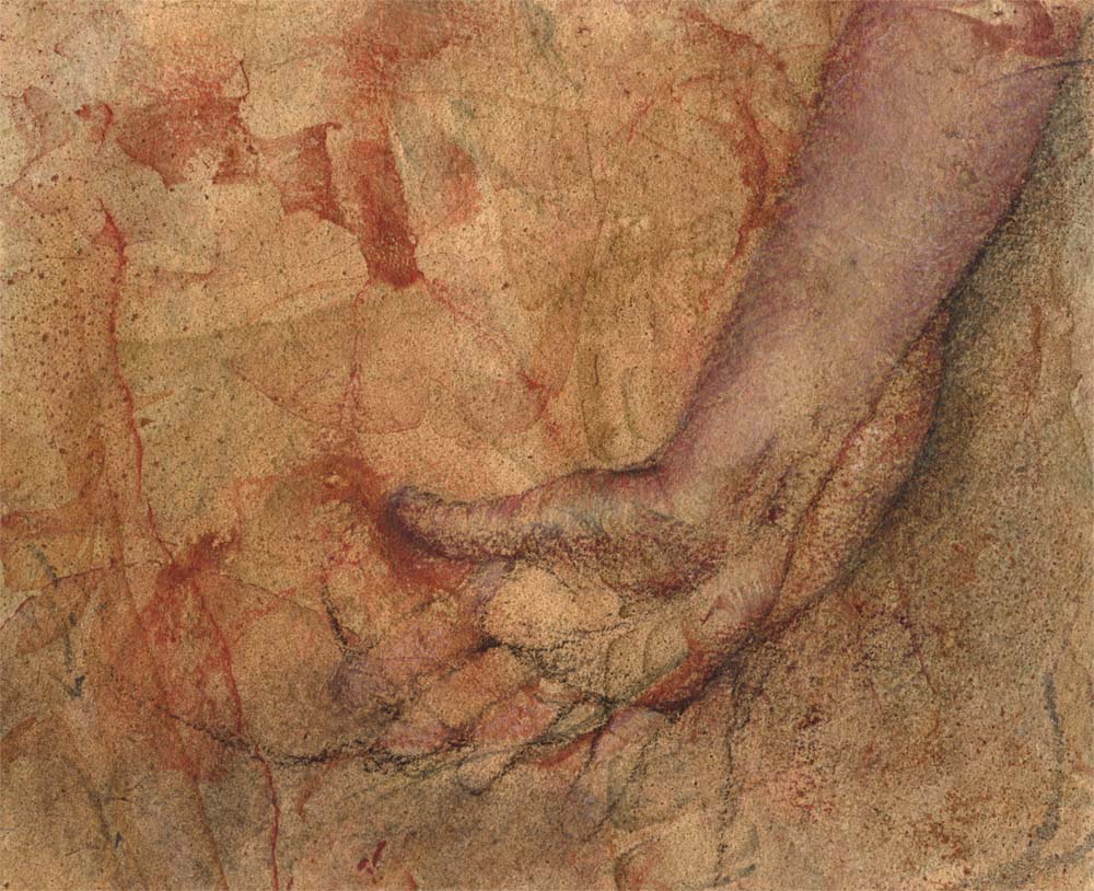 Palegold hands, 10.5 x 13.5 in., oils, bronze powder, charcoal, pastel and oil crayon on Moulin de Fleurac, 1999